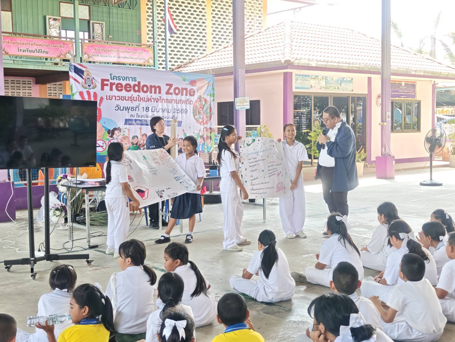 วันที่ 18 มีนาคม 2569 เวลา 09.30 น. นายทิพเมษฐ์ สังขวรรณะ ผอ.ปปส.ภ.7 มอบหมายให้ นายกานต์ มีนุช นักวิเคราะห์นโยบายและแผนปฏิบัติการ พร้อมคณะ ร่วมเป็นวิทยากรบรรยายในโครงการ “Freedom Zone เยาวชนรุ่นใหม่ห่างไกลยาเสพติด จังหวัดนครปฐม ประจำปี 2569” จัดโดยสภาเด็กและเยาวชนจังหวัดนครปฐม ณ ลานอเนกประสงค์ โรงเรียนบ้านรางมะเดื่อ ตำบลสามควายเผือก อำเภอเมืองนครปฐม จังหวัดนครปฐมการบรรยายครั้งนี้มุ่งเน้นการเสริมสร้างความรู้เบื้องต้นเกี่ยวกับยาเสพติดให้โทษ การสร้างความตระหนักถึงโทษและพิษภัยของยาเสพติด พร้อมทั้งถ่ายทอดทักษะสำคัญให้กับนักเรียนชั้น ป.1 – ป.6 จำนวน 60 คน อาทิ ทักษะการปฏิเสธเมื่อถูกชักชวนให้เสพยา ทักษะการคิดวิเคราะห์และการตัดสินใจในสถานการณ์เสี่ยง รวมถึงกิจกรรมฝึกปฏิบัติ เช่น การออกแบบพื้นที่ปลอดภัยจากยาเสพติด และการสร้างสรรค์คอนเทนท์/ข้อความรณรงค์ เพื่อปลูกฝังค่านิยม “คนรุ่นใหม่ ห่างไกลยาเสพติด”ทั้งนี้ เพื่อเสริมสร้างภูมิคุ้มกันทางความคิดให้แก่เยาวชน ให้สามารถป้องกันตนเองจากปัญหายาเสพติด และเป็นพลังสำคัญในการร่วมขับเคลื่อนสังคมให้ปลอดภัยจากยาเสพติดอย่างยั่งยืน