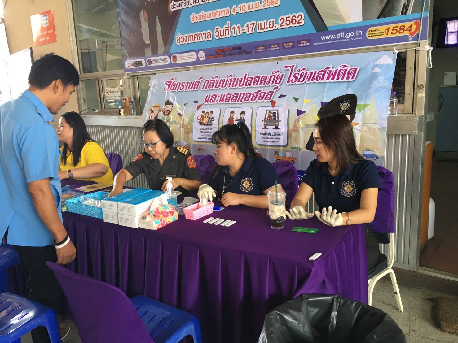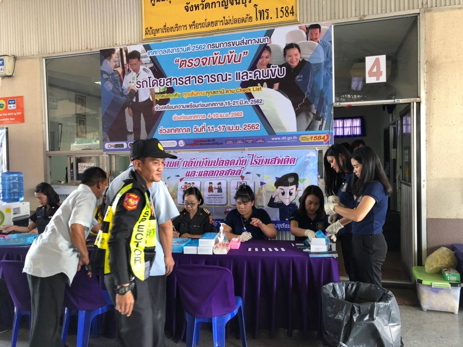 โดยการแจกสื่อแผ่นผับสร้างการรับรู้ความเข้าใจเกี่ยวกับยาเสพติดแก่ผู้ขับขี่และประชาชนทั่วไปในช่วงเทศกาลสงกรานต์ และการไม่รับฝากสิ่งของจากบุคคลอื่น รวมถึงสร้างความปลอดภัยให้กับผู้ใช้บริการรถโดยสารสาธารณะ ภายใต้แนวความคิด "สงกรานต์ กลับบ้านปลอดภัย ไร้ยาเสพติดและแอลกอฮอล์" โดย สุ่มตรวจค้นสัมภาระจากผู้โดยสารรถประจำทางสาธารณะ ในเขตจังหวัดกาญจนบุรีและสุ่มตรวจปัสสาวะผู้ขับขี่รถโดยสารสาธารณะ จำนวน 67 คน ผลการตรวจปัสสาวะไม่พบสารเสพติดแต่อย่างใด