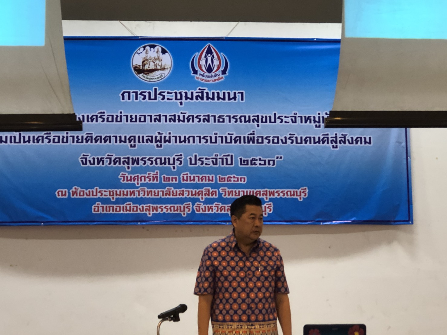 เมื่อวันที่ 23 มีนาคม 2561 เวลา 9.30 น. ผอ.ปปส.ภ.7 มอบหมาย นายสุพจน์ สมบูรณ์ทรัพย์ นักวิเคราะห์นโยบายและแผนชำนาญการ และนางสาววิจิตรา ศรีดี นักวิเคราะห์นโยบายและแผนชำนาญการ เป็นวิทยากรบรรยายและเข้าร่วมสังเกตุการณ์ในโครงการเสริมสร้างเครือข่ายอาสาสมัครสาธารณสุขประจำหมู่บ้าน (อสม.) ณ หอประชุม มหาวิทยาลัยสวนดุสิต วิทยาเขตสุพรรณบุรี โดยได้ร่วมบรรยายในหัวข้อ ไทยนิยมยั่งยืน ร่วมแก้ไขปัญหายาเสพติด โครงการประชุมสัมมนาดังกล่าวมีวัตถุประสงค์เพื่อพัฒนาศักยภาพ อสม.ในพื้นที่ของจังหวัดสุพรรณบุรี ให้เป็นผู้มีความรู้และความเข้าใจเกี่ยวกับแนวทางการดำเนินงานติดตามดูแลและช่วยเหลือผู้ผ่านการบำบัดรักษา ให้พร้อมและสามารถกลับไปใช้ชีวิตประจำวันได้อย่างปกติสุข โครงการดังกล่าวดำเนินการจัดทั้งสิ้นจำนวน 3 รุ่น โดยในวันที่ 23 มี.ค. 61 เป็นการจัดประชุมในรุ่นที่ 2 ซึ่งมีนายทรงพล ใจกริ่ม รองผู้ว่าราชการจังหวัดสุพรรณบุรีให้เกียรติเป็นประธานในพิธีเปิด กลุ่มเป้าหมายจะประกอบไปด้วย อสม. ในพื้นที่ อ.อู่ทอง อ. สองพี่น้อง อ.ดอนเจดีย์จำนวนทั้งสิ้นประมาณ 700 คน