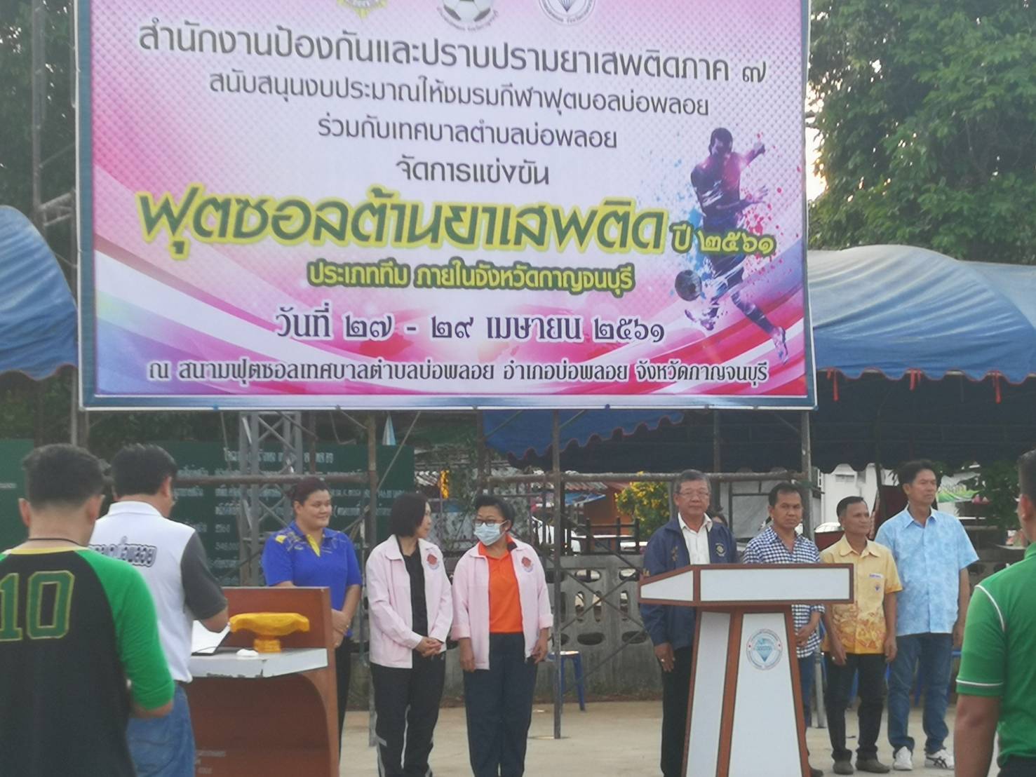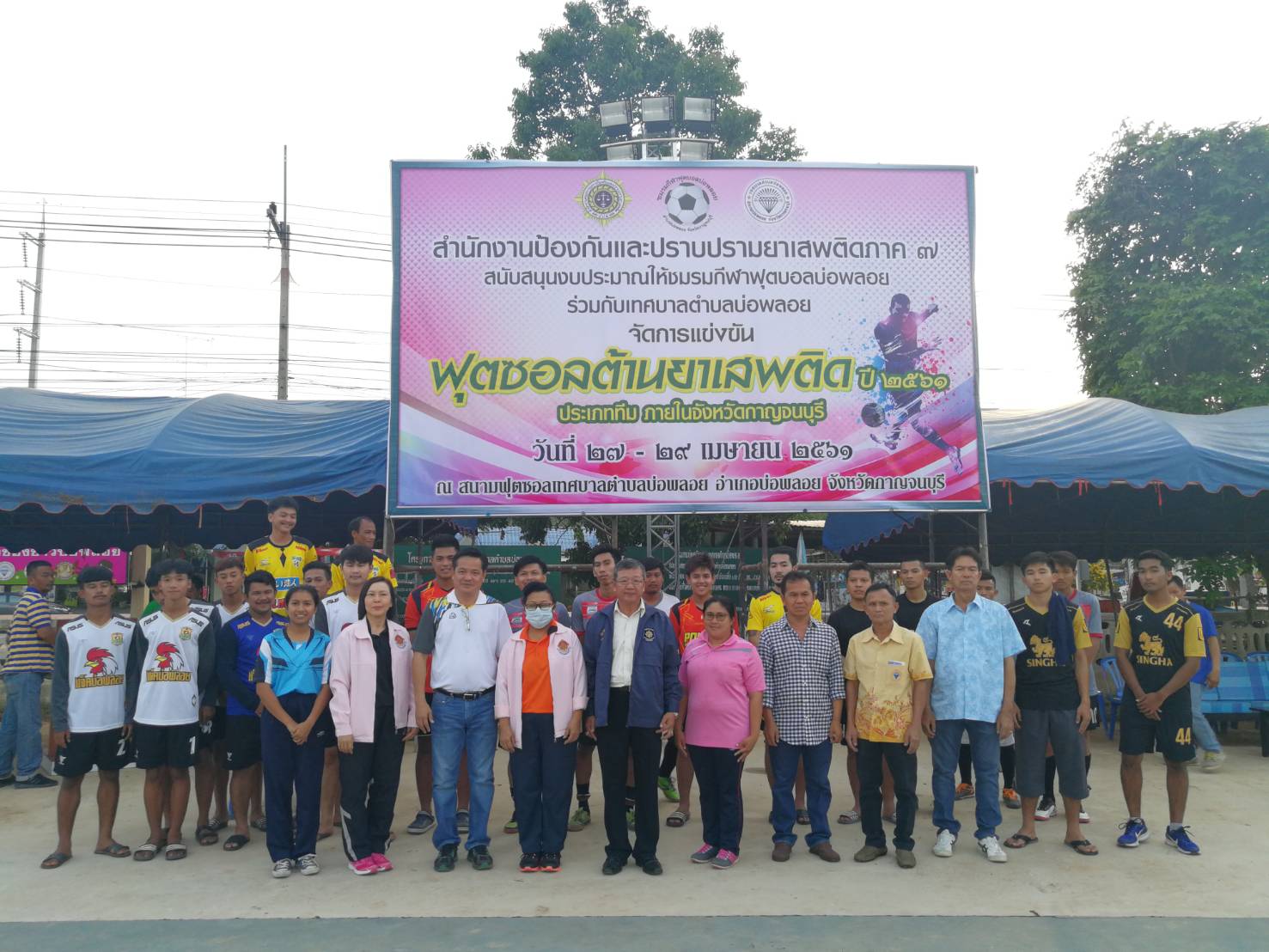 วันที่ 27 เมษายน 2561 เวลา 18.00 น. นายวรเชษฐ์ สัจจาลักษณ์ ผู้อำนวยการส่วนอำนวยการบังคับใช้กฏหมาย ปปส.ภ.7 เป็นประธานในพิธีเปิดการแข่งขัน "ฟุตซอลต้านยาเสพติด ประจำปี 2561" ณ สนามฟุตซอลเทศบาลตำบลบ่อพลอย อำเภอบ่อพลอย จังหวัดกาญจนบุรี ซึ่งการจัดแข่งขันกีฬาในครั้งนี้ กำหนดจัดขึ้นระหว่างวันที่ 27 - 29 เมษายน 2561 โดยมีวัตถุประสงค์เพื่่อให้เด็ก เยาวชน และประชาชนได้เข้ามามีส่วนร่วมในการแข่งขันกีฬาฟุตซอล ใช้เวลาว่างให้เกิดประโยชน์ ไม่เข้าไปเกี่ยวข้องกับยาเสพติด ส่งเสริมและสร้างจิตสำนึกในการเล่นกีฬาและออกกำลังกาย มีผู้เข้าร่วมแข่งขันจำนวน 8 ทีม จากพื้นที่จังหวัดกาญจนบุรี โดยได้รับการสนับสนุนงบประมาณเงินอุดหนุนด้านการป้องกันและแก้ไขปัญหายาเสพติด จากสำนักงาน ปปส.ภ.7 จำนวน 127,050 บาท