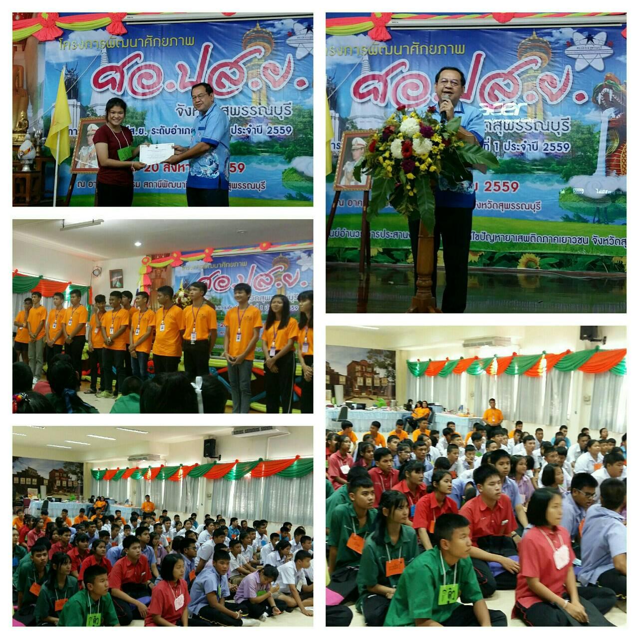 วันที่ 20 สิงหาคม 2559 เวลา 13.00 น. นายพิสุทธิ์ เจริญฤทธิ์ ผู้เชี่ยวชาญด้านการป้องกันและปราบปรามยาเสพติดภาค 7 เป็นประธานพิธีปิดโครงการพัฒนาศักยภาพ ศอ.ปส.ย.จังหวัดสุพรรณบุรี และการจัดตั้ง ศอ.ปส.ย.ในระดับอำเภอ ณ อาคารฝึกอบรมสถานีพัฒนาที่ดินจังหวัดสุพรรณบุรี อำเภอเมือง จังหวัดสุพรรณบุรี ซึ่งโครงการดังกล่าวกำหนดจัดขึ้นระหว่างวันที่ 18 - 20 สิงหาคม 2559 วัตถุประสงค์เพื่อ ให้ความรู้แก่เด็กและเยาวชน ให้ตระหนักถึงพิษภัยของยาเสพติด และให้ความสำคัญในการป้องกันและแก้ไขปัญหายาเสพติด อีกทั้งเป็นการสร้างเครือข่ายในการร่วมมือในการป้องกันและแก้ไขปัญหายาเสพติดเพื่อพัฒนาเยาวชนในพื้นที่ให้เป็นทรัพยากรที่ทรงคุณค่าของประเทศต่อไป ผู้เข้าร่วมอบรม ได้แก่ นักเรียน/เยาวชน ในพื้นที่ 10 อำเภอ ของจังหวัดสุพรรณบุรี รวมจำนวนทั้งสิ้นประมาณ 120 คน