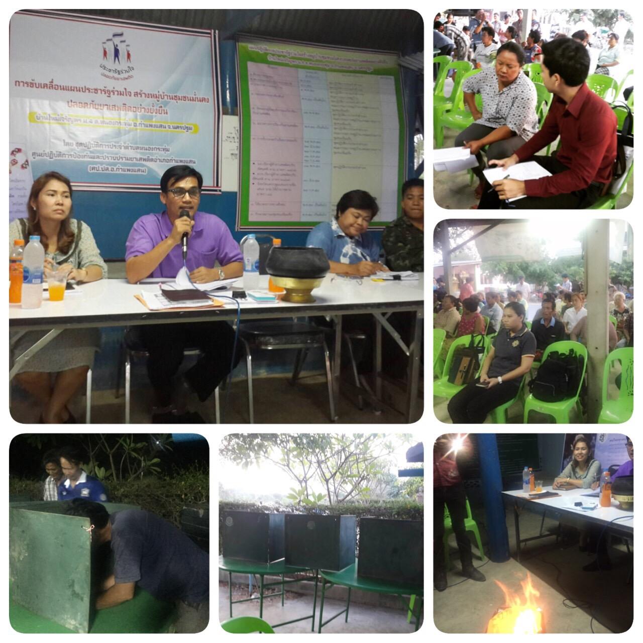 วันที่ 12 พ.ค. 2559 เวลา 18.30 น. น.ส.ฐิภาพรรณ ใจช่วง นวค.ชำนาญการ น.ส.วิจิตรา ศรีดี นวค.ชำนาญการ และนายนันทพงษ์ บุญพงษ์ จนท.วิเคราะห์นโยบายและแผน เป็นผู้แทน ปปส.ภาค 7 ร่วมกับฝ่ายปกครอง อ.กำแพงแสน จ.นครปฐม และชุดปฏิบัติการประจำตำบล อ.กำแพงแสน เข้าดำเนินการขับเคลื่อนแผนประชารัฐร่วมใจ สร้างหมู่บ้าน/ชุมชนมั่นคง ปลอดภัยยาเสพติด พ.ศ. 2559 - 2560 ในขั้นตอนที่ 5 คัดแยกผู้มีพฤติกรรมเกี่ยวข้องกับยาเสพติด (เวทีประชาคมครั้งที่ 2) ตามแนวทาง 9 ขั้นตอนสร้างหมู่บ้านชุมชนเข้มแข็ง ในพื้นที่ บ.ใหม่เจริญพร หมู่ 4 ต.หนองกระทุ่ม อ.กำแพงแสน จ.นครปฐม ซึ่งเป็นหมู่บ้านนำร่องของ จ.นครปฐม ผลจากการประชาคมคัดแยกผู้มีพฤติกรรมเกี่ยวข้องกับยาเสพติด ฝ่ายปกครอง อ.กำแพงแสน จ.นครปฐม จะดำเนินการตรวจสอบข้อเท็จจริงของข้อมูลและดำเนินการในส่วนที่เกี่ยวข้องต่อไป ทั้งนี้ การประชุมประชาคมดังกล่าว ผู้แทน ปปส.ภาค 7 ได้ชี้แจงแนวทางการสร้างความเข้มแข็งให้กับประชาชนในหมู่บ้าน พร้อมทั้งขอความร่วมมือประชาชนในพื้นที่ช่วยกันสอดส่องดูแลเด็ก เยาวชน และประชาชนทั่วไป ไม่ให้เข้าไปเกี่ยวข้องหรือมีพฤติกรรมเกี่ยวข้องกับยาเสพติด การประชุมประชาคมดังกล่าว มีหน่วยงานภาครัฐ และประชาชนเข้าร่วม ประกอบด้วย จนท.ปปส.ภาค 7 ฝ่ายปกครอง ผู้แทนทหาร จากชุดปฏิบัติการประสานพื้นที่ ร.29 พัน 3 จนท.ตำรวจ กำนัน ผู้ใหญ่บ้าน ชุดปฏิบัติการประจำตำบล (ครู ข) อ.กำแพงแสน และประชาชนในพื้นที่ จำนวน 60 คน